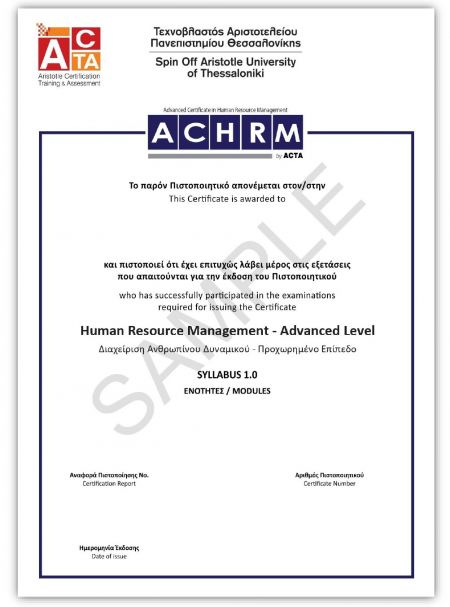 Η εκπαίδευση οδηγεί στην Πιστοποίηση "Διοίκηση Ανθρώπινων Πόρων", από την ACTA, Τεχνοβλαστός Αριστοτέλειου Πανεπιστημίου Θεσσαλονίκης.
